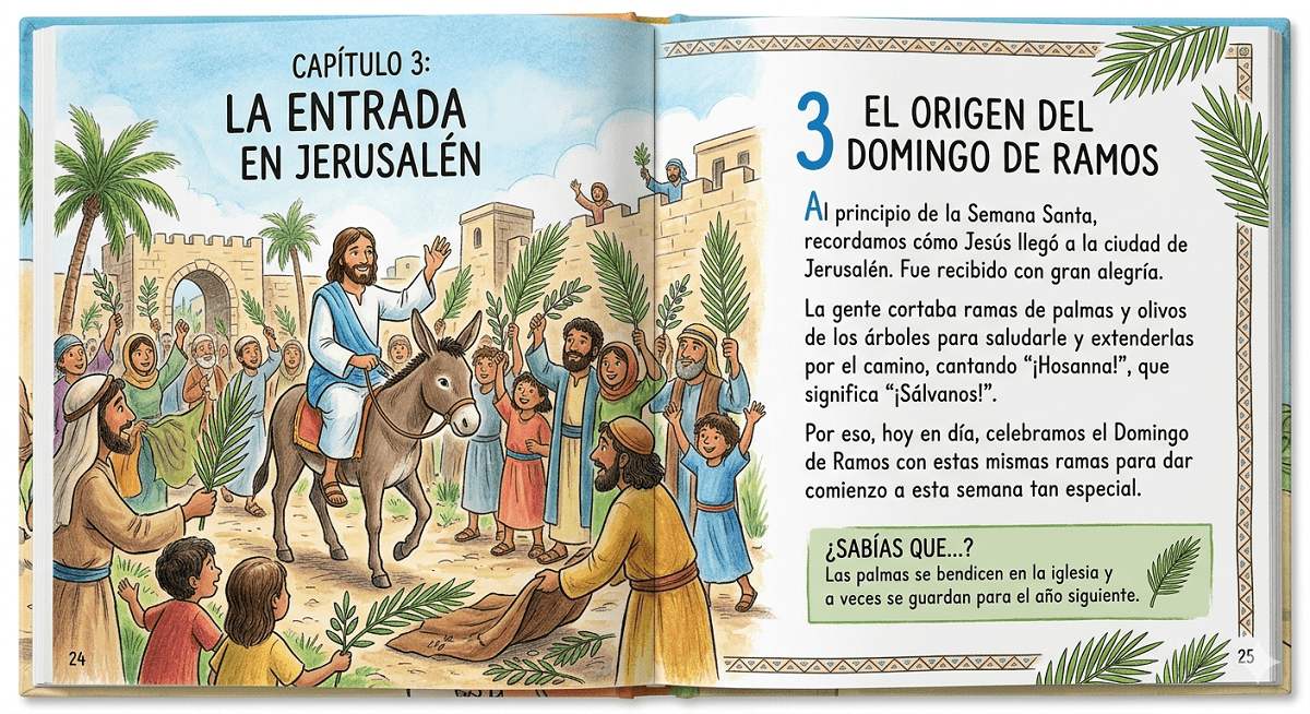 Domingo de Ramos: Celebramos la entrada de Jesús en Jerusalén. La gente lo recibió con palmas y ramos de olivo, por eso ese día verás a muchos niños y sus padres llevando palmas blancas rizadas muy bonitas.